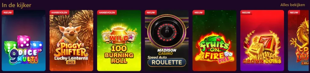 In onze vergelijking van het spelaanbod valt de brede spelselectie van Madison casino op: van Gokkasten zoals Book of Dead en Big Bass Bonanza tot tafelspellen zoals Blackjack en Baccarat. Live dealer-games van Evolution Gaming zorgen voor de sfeer van een echt casino. Betaalmethoden en mobiele prestaties ondersteunen snel Spelen. Voor veel Belgische spelers is de conclusie duidelijk: Dit casino is een succes!